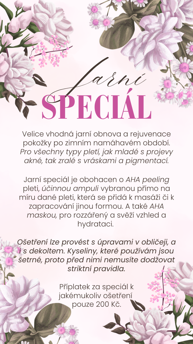 Stejně jsko hydratační ošetření pleti je toto ošetření vhodné při první návštěvě salonu, také pokud máte konkrétní problémy na pleti, které potřebujete řešit (např. "pupínky", vrásky, pigmentace, rozšířené žilky, růžovka, atd...).